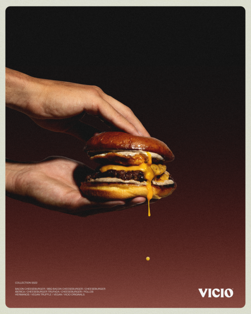 Así define Aleix Puig los valores (o más bien los “pecados”) que caracterizan a Vicio, su criatura, que hace poco ha cumplido sus dos primeros años de vida y que se ha abierto paso a gritos y codazos en un mundo en el que parecía no haber mucho margen para la disrupción: el de la venta de hamburguesas. Y en este tiempo ha pasado de tener un punto de venta a 9, de 7 empleados a más de 250, de viajar de Barcelona a Madrid (y con vistas a expandirse por el resto del mapa, tanto nacional como internacional), un éxito que, además de la calidad de su producto, se ha cimentado sobre todo en campañas rompedoras que pueden tomar la forma de vídeos (prácticamente cortometrajes, de gran nivel creativo), inmensas vallas publicitarias, paracaidistas que vuelan hamburguesa en mano o, simplemente, frases tan contundentes como las que se mencionaban más arriba, que sus 120.000 seguidores en Instagram, su principal terreno de juego, no dejan de celebrar y compartir. “Desde el principio hemos trabajado las redes sociales de una forma muy depurada y disruptiva para lo que era una marca de alimentación. Todos hemos visto páginas más o menos guays en el mundo de la moda, del lifestyle, del deporte extremo… pero en el terreno del food delivery todo era muy básico. Ahí vimos que había una oportunidad y a través del departamento de branding tratamos de sacar algo distinto”.