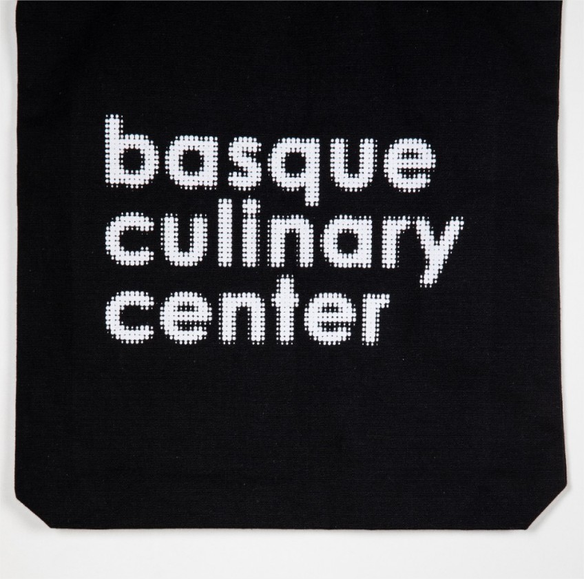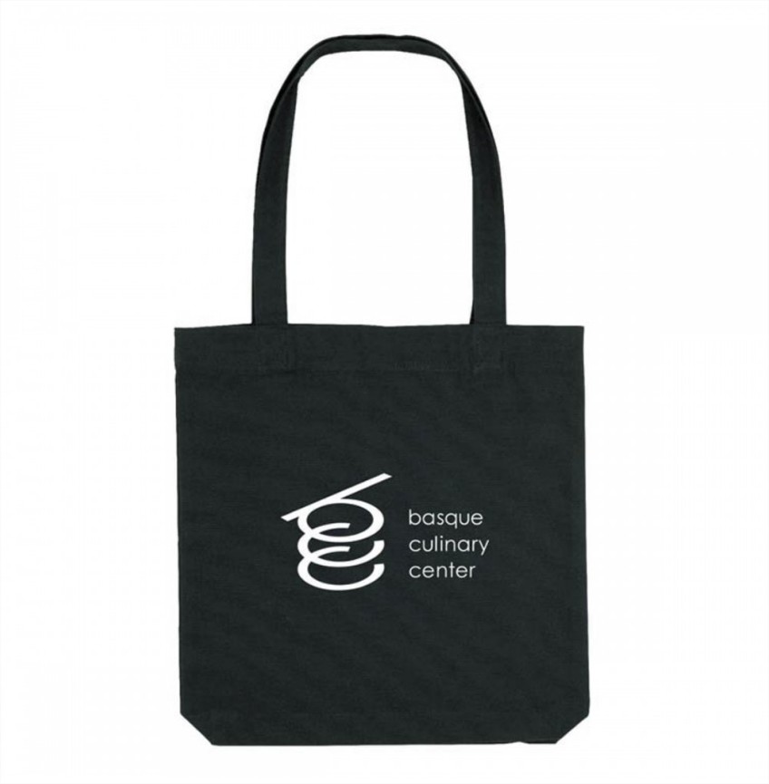 Tote bag de tela básico de color negro. Estampado de un gráfico de 'Basque Culinary Center' contrastado en uno de los lados y el logotipo de Basque Culinary Center en el otro.