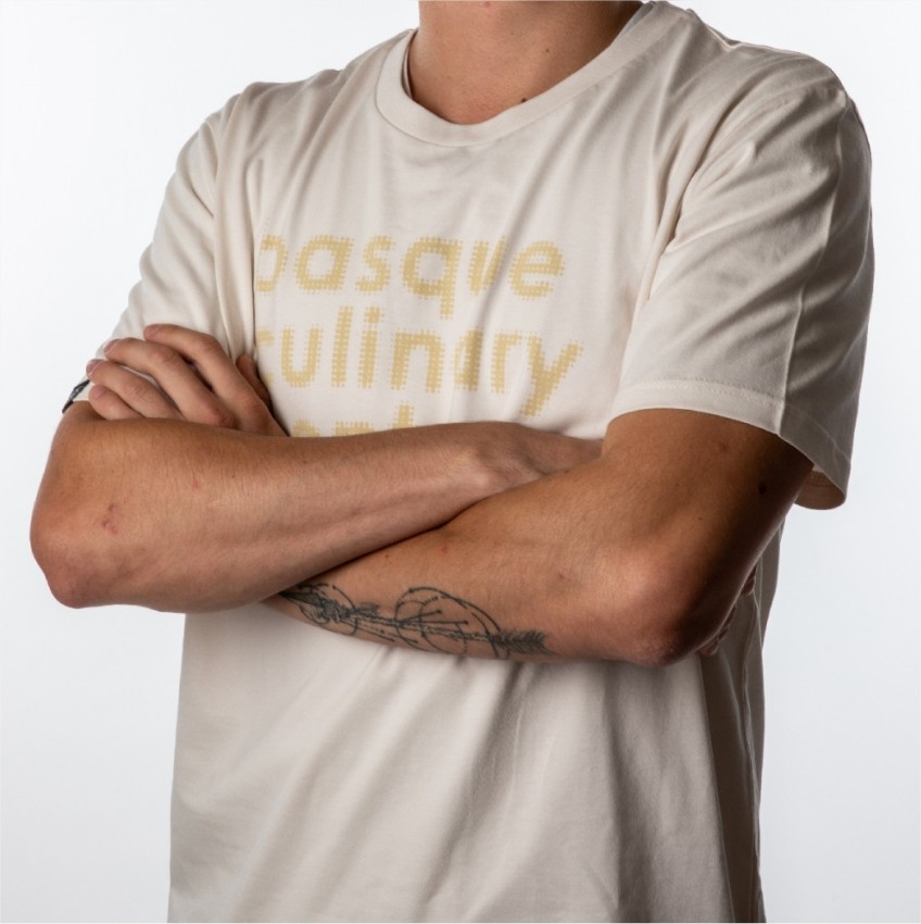 La camiseta está compuesta por un 100% de algodón orgánico y cumple con todos los requisitos que exige la asociación PETA para considerarla una camiseta Approved Vegan y libre del testeo con animales. Todas las camisetas de Basque Culinary Center están fabricadas con materiales cuidadosamente seleccionados con el objetivo de minimizar el impacto medioambiental así como mantener unos estándares de producción que respeten todos los valores de la cadena de trabajo, desde la elaboración de la camiseta hasta su venta.