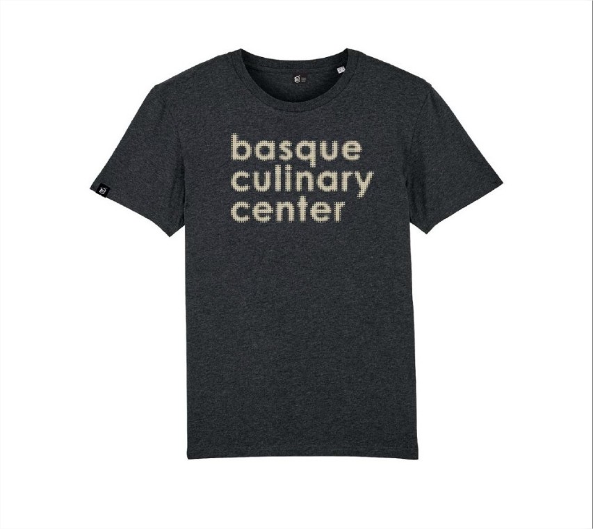 Camiseta de manga corta y cuello redondo. Camiseta de color dark grey heather con estampado de un gráfico de 'Basque Culinary Center' contrastado en el frente. Detalle del logotipo de Basque Culinary Center en el interior y etiqueta negra cosida en la manga derecha.