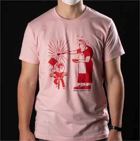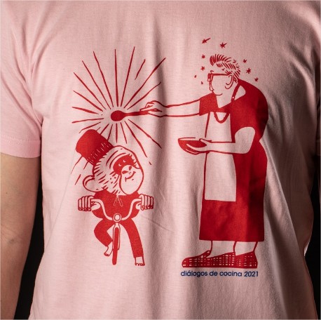 Camiseta de manga corta y cuello redondo. Camiseta de color rosa con estampado de un gráfico de 'Diálogos de Cocina' contrastado en el frente.