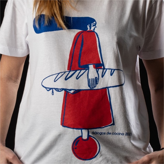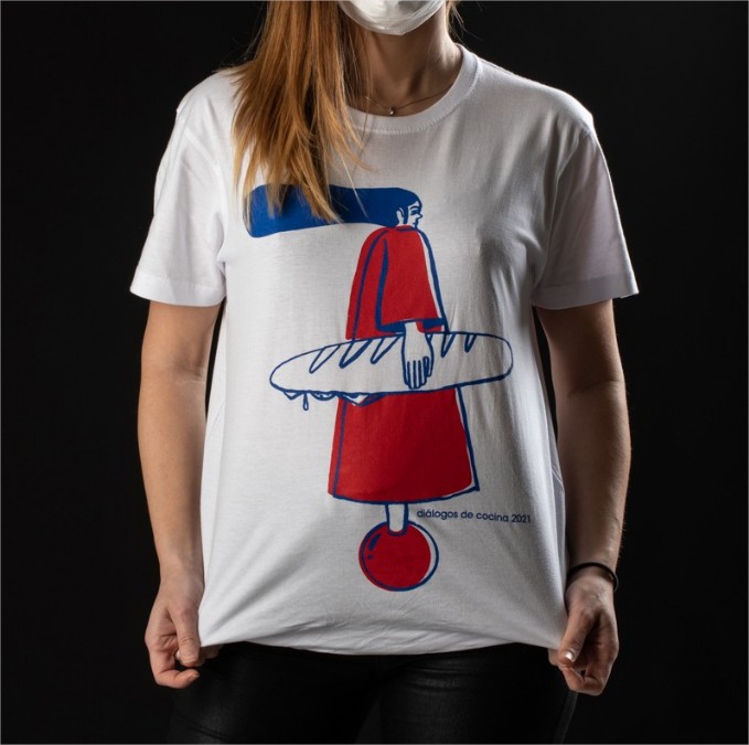 Camiseta de manga corta y cuello redondo. Camiseta de color blanco con estampado de un gráfico de 'Diálogos de Cocina' contrastado en el frente.