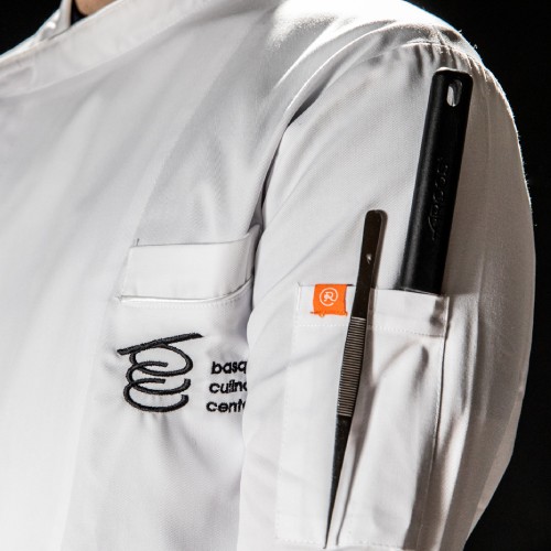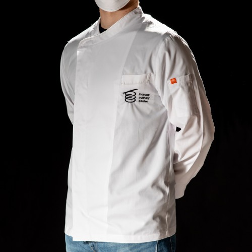 Chaquetilla de los chefs de Basque Culinary Center. Chaquetilla de color blanco y cuello mao. Detalle del logotipo de Basque Culinary Center bordado en el pecho. Un bolsillo frontal y otro en la manga izquierda que harán de esta chaquetilla una prenda muy funcional en la cocina. Cierre de botones clip cruzado y escondido en el frente para una mayor comodidad y espalda de malla transpirable de tejido coolmax que permitirá mitigar el calor de los fogones. Debido a su sencillez y versatilidad, esta chaquetilla es perfecta para cualquier cocinero o amante de la gastronomía. También es la chaquetilla de chef oficial que utilizan los alumnos de Basque Culinary Center.