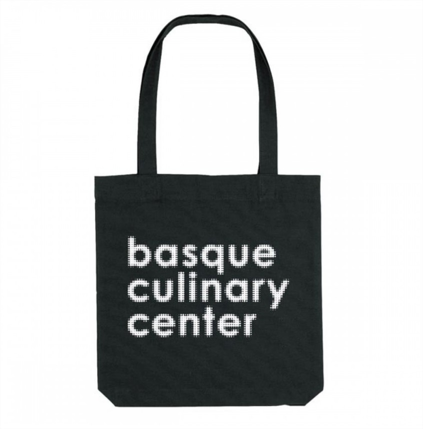Tote Bag de algodón orgánico en color natural creada a partir de una colaboración de Basque Culinary Center, con el estudio de arte y artesanía SUUIT. Consta de dos elementos, en la parte frontal, una estampación con el dibujo pintado por la artista a 5 colores, y en la parte dorsal, los logos de Basque Culinary Center y de SUUIT by Luisa Chillida.