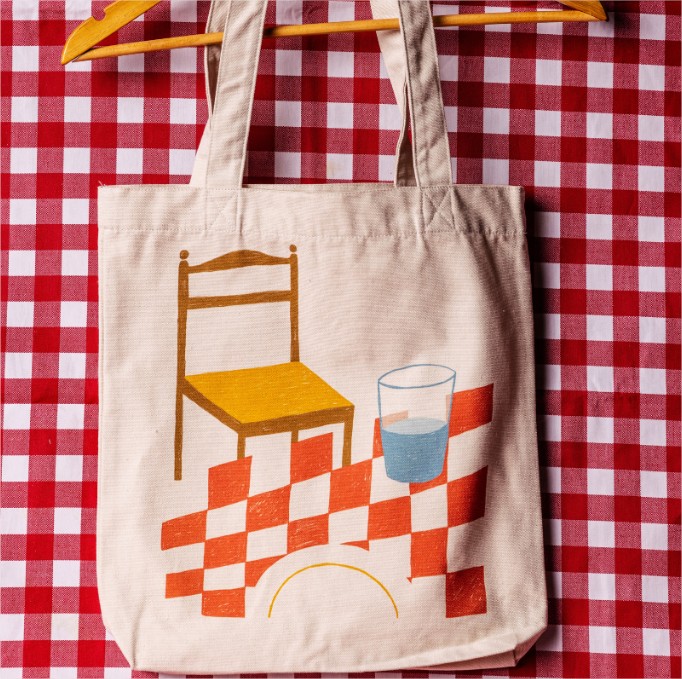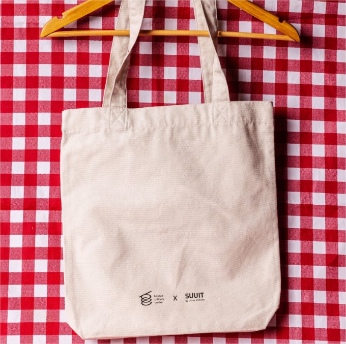 Tote Bag de algodón orgánico en color natural. Consta de dos elementos, en la parte frontal, una estampación con el dibujo pintado por la artista, y en la parte dorsal, los logos de Basque Culinary Center y de Suuit by Luisa Chillida.