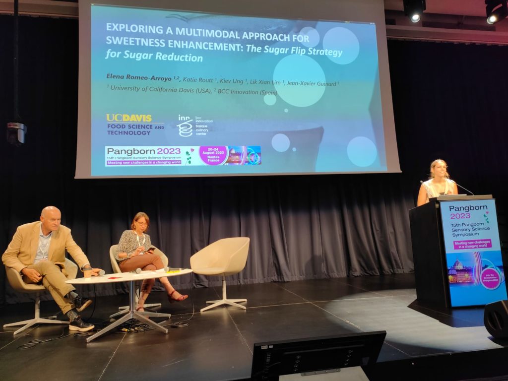 Meanwhile, Elena Romeo, a researcher specializing in sensory analysis at BCC Innovation, presented on the topic of "Exploring a Multimodal Approach for Sweetness Enhancement: The Sugar Flip Strategy for Sugar Reduction." This subject is a component of a research initiative led by Dr. Jean-Xavier Guinard from UC Davis, conducted in collaboration with BCC Innovation as part of Romeo's doctoral thesis at the University of California, Davis. It was moderated by Dr. Agnès Giboreau, Director of the Institut Lyfe Research and Innovation Center, along with Dr. Jean-Xavier Guinard, who is a professor and sensory scientist at the University of California, Davis.