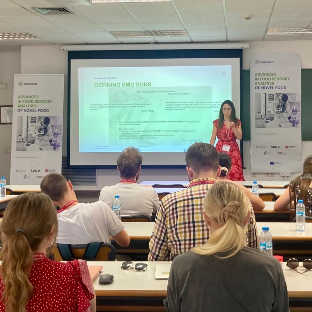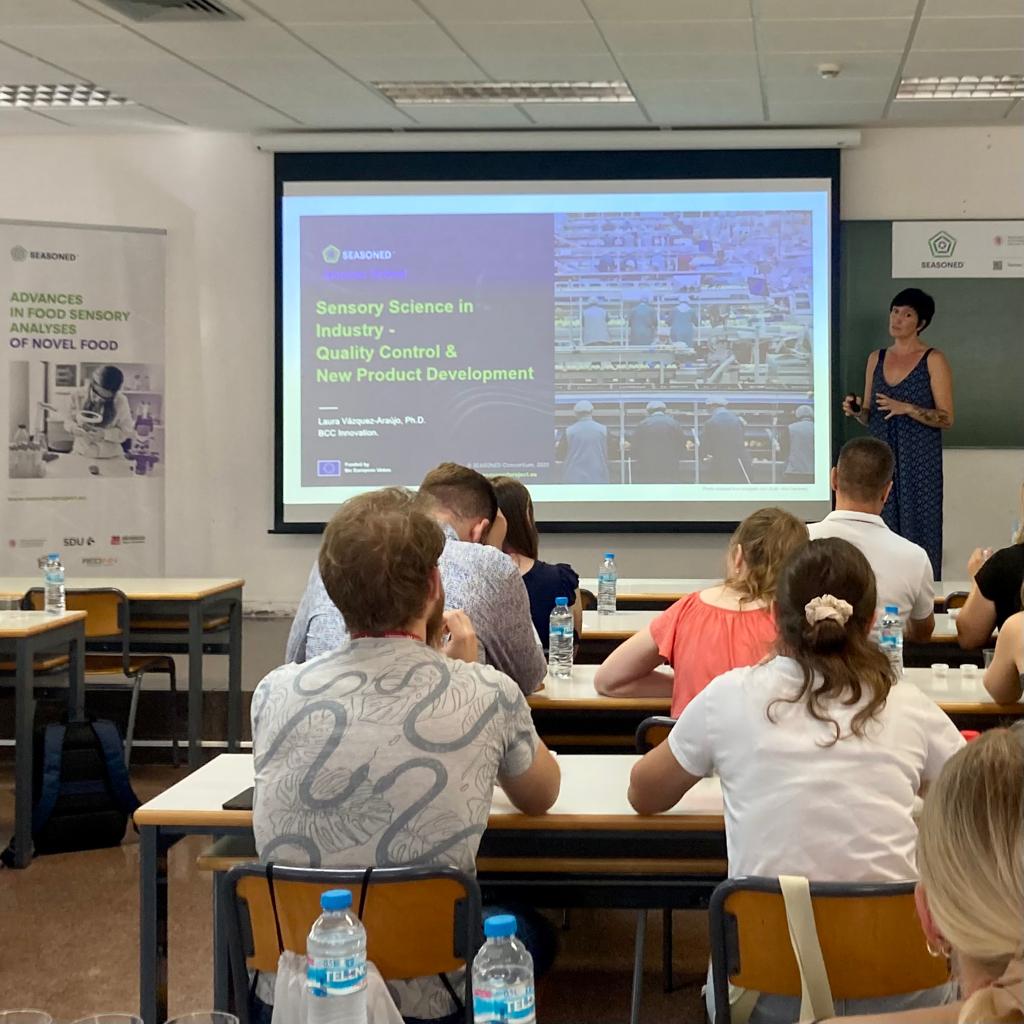Laura Vázquez and María Mora, researchers from the sensory analysis area of BCC Innovation, have recently participated in the Summer School organized by the European research project SEASONED, within the framework of Horizon Europe (HE) Twinning, that took place at Miguel Hernández University of Elche. Laura Vázquez focused her presentation on the role that sensory sciences have in terms of quality control and development of new productsin food industry. In this sense, she spoke about different departments that use sensory analysis techniques and she mentioned the most used methodologies at different stages of the production process. For her part, María Mora talked about the potential of emotions beyond the study of consumer acceptance. She showed different methods for measuring emotional response, both implicit and explicit, underlining the usefulness of emotional lexicons. The Summer School was attended by students, researchers and food industry professionals from different nationalities, including BCC Innovation researchers Paula Torán and Jara Domper. During the five-day meeting, all the participants attended several conferences and had also the opportunity to take part in different workshops in order to increase their knowledge in sensory analysis as well to share their knowledge and professional experiences. The SEASONED project, led by Wroclaw University of Environmental and Life Sciences, is funded by the European Union and counts among its partners with the Italian innovation consultancy REDINN and with leading European research institutions as the University of Southern Denmark, BCC Innovation and Miguel Hernández University, which has organized this last meeting.