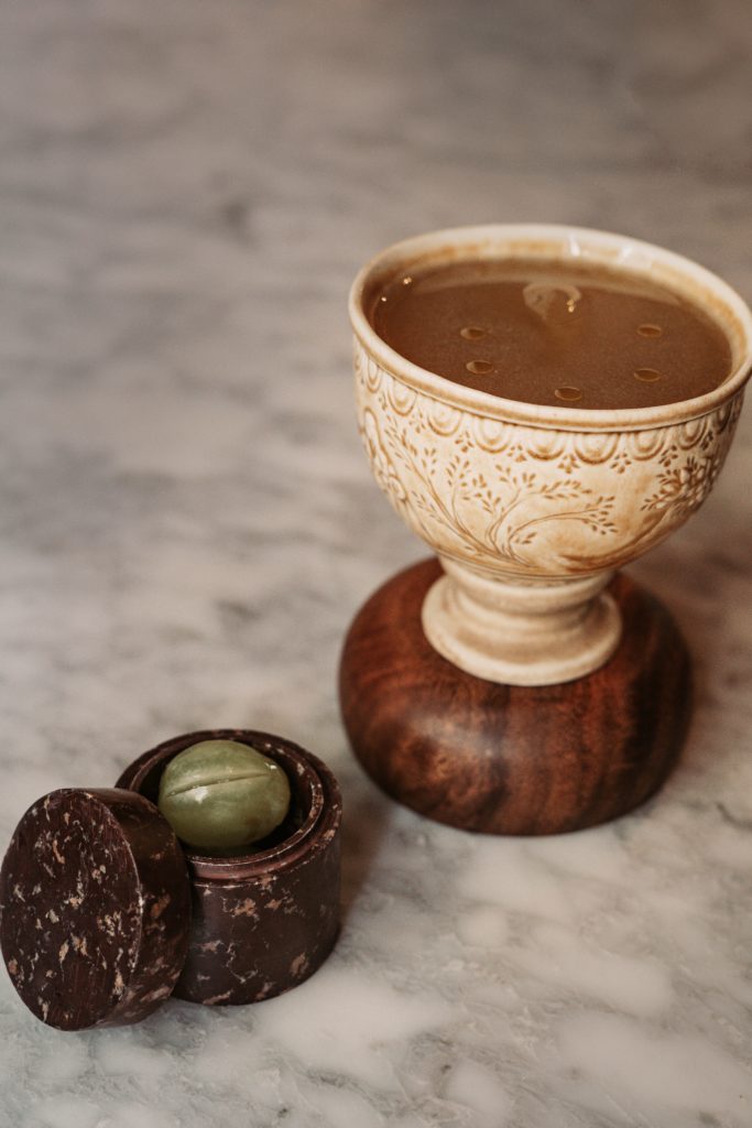 Es que la coctelería es gastronomía, entendida como algo que busca satisfacer, emocionar y hacer algo más que saciar el hambre o la sed. La carta que hemos tenido hasta ahora, por ejemplo, se llama “Edades” y va sobre la evolución humana. Fue algo que surgió de preguntarnos de dónde viene la necesidad de beber, hasta cuándo se remontan los bares, y así, con la ayuda de distintos expertos que nos asesoraron, nos remontamos hasta el paleolítico y llegamos hasta la actualidad, con Apple y la devoción por la tecnología. El cóctel del paleolítico va con un fermento de piña y con mezcal, con el que representamos el fuego, que fue lo que nos cambió y nos hizo humanos. Además, el mezcal tiene ese toque divino, porque según la leyenda, los dioses lanzaron un rayo a un agave y así nació este licor. Ana Felipe, que nos desarrolla la vajilla y la cerámica, diseñó una calavera en la que lo servimos, porque algo así no tenía sentido que fuese en un vaso de vidrio. Con la información que tienes o que te cuentan tratas de transmitir un mensaje, que en este caso es: somos monos que comían fruta fermentada y gracias al fuego y a cocinar estamos aquí y gracias a esos monos alcohólicos la evolución ha sido mucho más divertida.