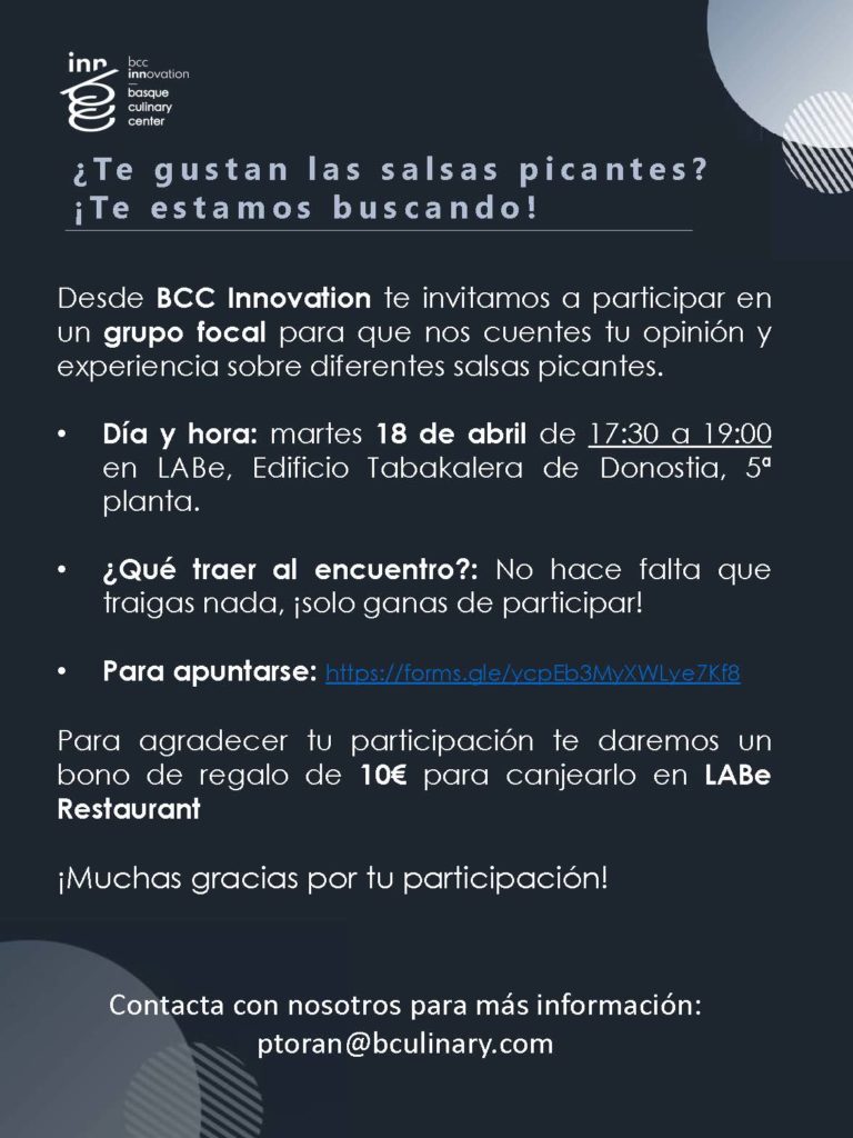 Desde BCC Innovation estamos buscando personas a las que les gusten las salsas picantes. Te invitamos a participar en un focus group que organizaremos el 18 de abril para que nos des tu opinión.