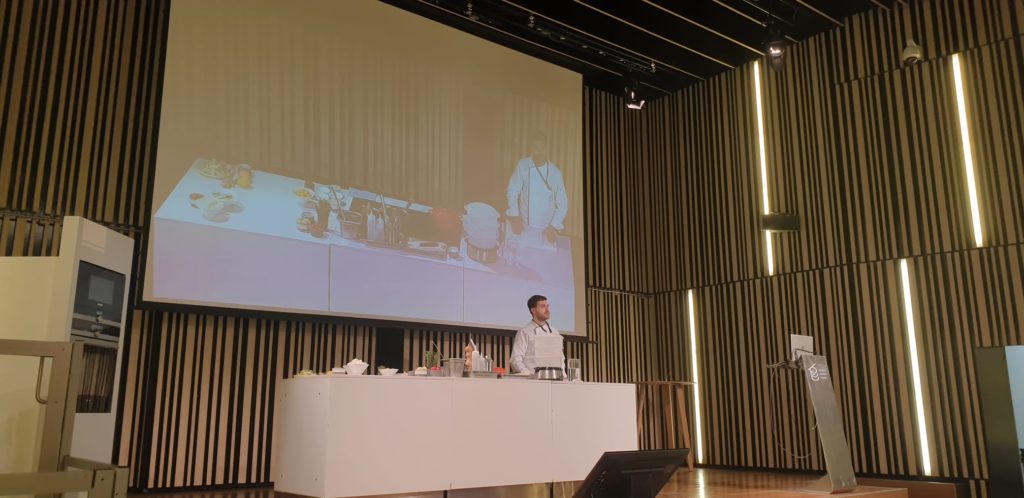 Al igual que en anteriores ocasiones, la jornada ha finalizado con un showcooking impartido por el chef investigador Nahuel Pazos, quien ha llevado a cabo diversas elaboraciones culinarias haciendo uso de algunas de las técnicas mencionadas anteriormente. Así, los y las participantes en la sesión tuvieron la oportunidad de aprender de primera mano cómo cocinar de manera saludable algunos platos como salmón al vapor con una velouté y calabacín en láminas o bacalao macerado al microondas con calabaza y zanahorias.