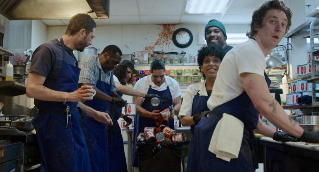 En Whites una vaca es “todas las piezas de carne que puedes obtener en una práctica bolsa de cuero” y cuando un cliente pide una “tortilla sin huevos” la primera solución que se plantea es ofrecerle un plato vacío espolvoreado con perejil. Estamos, por tanto, en el territorio de la comedia pura, donde la cocina no tiene la menor importancia (al contrario que en The Bear, donde lo es todo) y no es sino un mero trasfondo sobre el que trazar las relaciones entre los personajes y disfrutar jugueteando con diálogos ingeniosos, en el que la comida apenas se muestra o se cita, si no es como vehículo para provocar la risa, cuando en The Bear ocupa con frecuencia el centro del plano, apetecible y suntuosamente fotografiada. De hecho, Whites podría transcurrir en una sucursal bancaria o en una tienda de juguetes con resultados similares. The Bear, por contra, pone sobre la mesa cuestiones candentes dentro del mundo de la gastronomía: el papel de las mujeres en el sector (llamar con el ambiguo “chef Terry” a la reputada cocinera que interpreta Olivia Colman no es casual y provoca exactamente el efecto que persigue, el mismo que causa la chef Sydney, mujer y negra, en un personaje que le supone un puesto, digamos, “de segunda”) , las barreras (sociales, mentales) que deben salvar las minorías étnicas para progresar en la industria, los mil y un problemas (económicos, legales, de mantenimiento, personales, de suministro, de falta o exceso de demanda….) con los que cada día tiene que lidiar la hostelería, las tensiones entre “alta” y “baja” cocina… construyendo un relato que parece caminar hacia el éxito a partir de una infinidad de fracasos, contingencias y catástrofes inesperadas que se superan a base de sangre, sudor, lágrimas, cortes y quemaduras.