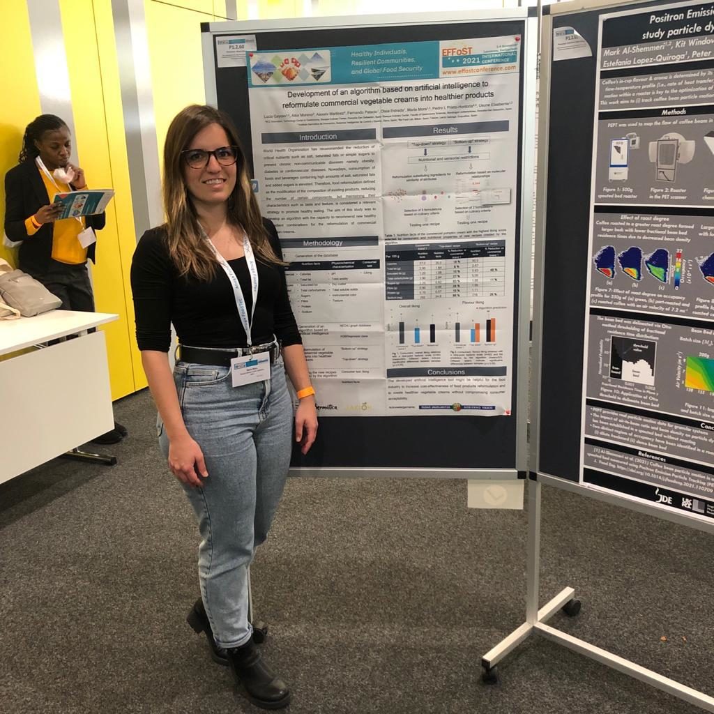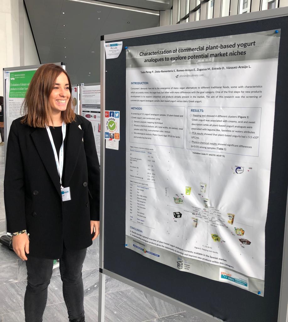 Shuyana Deba, por su parte, presentó el póster "Caracterización de yogures análogos de origen vegetal para explorar potenciales nichos de mercados" Debido a que cada vez hay una mayor demanda de alternativas veganas a diferentes alimentos tradicionales. Uno de los primeros pasos a la hora de desarrollar un nuevo producto es conocer y caracterizar qué otros alimentos de su categoría hay en el mercado. Por lo tanto, en este trabajo se realizó una caracterización físico-química, microbiológica y sensorial de 10 análogos de yogur de base vegetal para definir los parámetros de mayor interés, y con ello desarrollar un nuevo análogo de yogur de origen vegetal.
