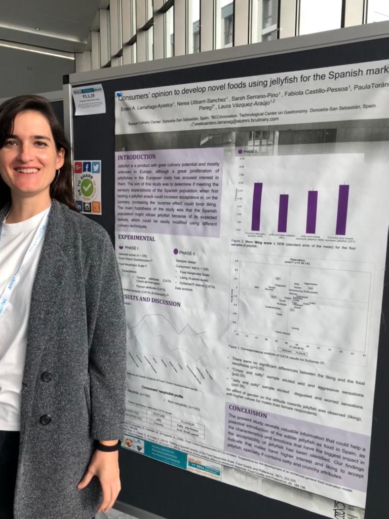 El póster "Opinión de los consumidores para desarrollar nuevos alimentos a partir de medusas para el mercado español", presentado por Paula Torán, parte de la idea de que la medusa es un alimento comúnmente consumido en Asia, especialmente en la zona sudeste del continente. Es un producto con un gran potencial culinario, pero prácticamente desconocido en la cultura gastronómica europea. Sin embargo, durante los últimos años se ha detectado una alta proliferación de este animal en las costas europeas, lo que ha despertado gran interés. El objetivo del estudio fue determinar qué estrategia favorecería la aceptación del consumo de medusa entre los consumidores occidentales: el cumplir con sus expectativas o el "efecto sorpresa".