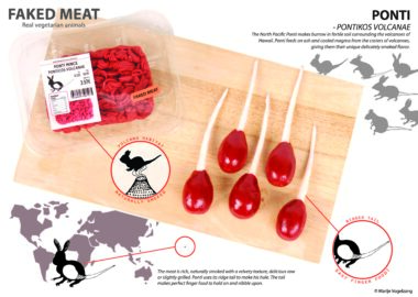 Como consecuencia de esta reflexión, Marije se dio cuenta de que había que inventarse una nueva narrativa, así que diseñó cuatro “animales vegetarianos” el herbast, el ponti, el biccio y el sapicu, de los cuales se obtienen “cortes” que no tienen nada que ver con los que estamos acostumbrados: la carne del herbast está precondimentada y es naturalmente cuadrada y fácil de repartir; el ponti es un roedor que vive en los volcanes (y tiene por tanto un toque ahumado) y se consume agarrándolo por la cola: el biccio es un pez que se alimenta de algas, por lo que su carne tiene rayas verdes que lo hacen muy propicio para utilizarlo como sashimi o sushi y está cargado de antioxidantes, y el sapicu es un pájaro que vive en los arces canadienses y se alimenta de su dulce savia, así que funciona muy bien en postres.