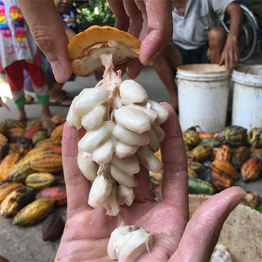 Por ejemplo, con las pieles del cacao hemos hecho cerveza con la gente de Hobac, vino con el Celler Batlliu y los chicos de Ama, en Irún, las están utilizando para una kombucha…  Si haces una infusión con ellas obtienes un té de pieles de cacao alucinante. En todos estos casos conservan todavía restos de fermentación de sus países de origen, así que la bebida final te muestra cosas de Vietnam, de India… Es muy guay. También estoy trabajando con la artista textil y diseñadora Arantza Vilas de Pinaki Studios en Brighton, que trabajó en Juego de Tronos, para extraer el pigmento de esas pieles y teñir con él una seda elaborada en el Reino Unido que no maltrata al gusano, con el fin de envolver las tabletas de mucílago.