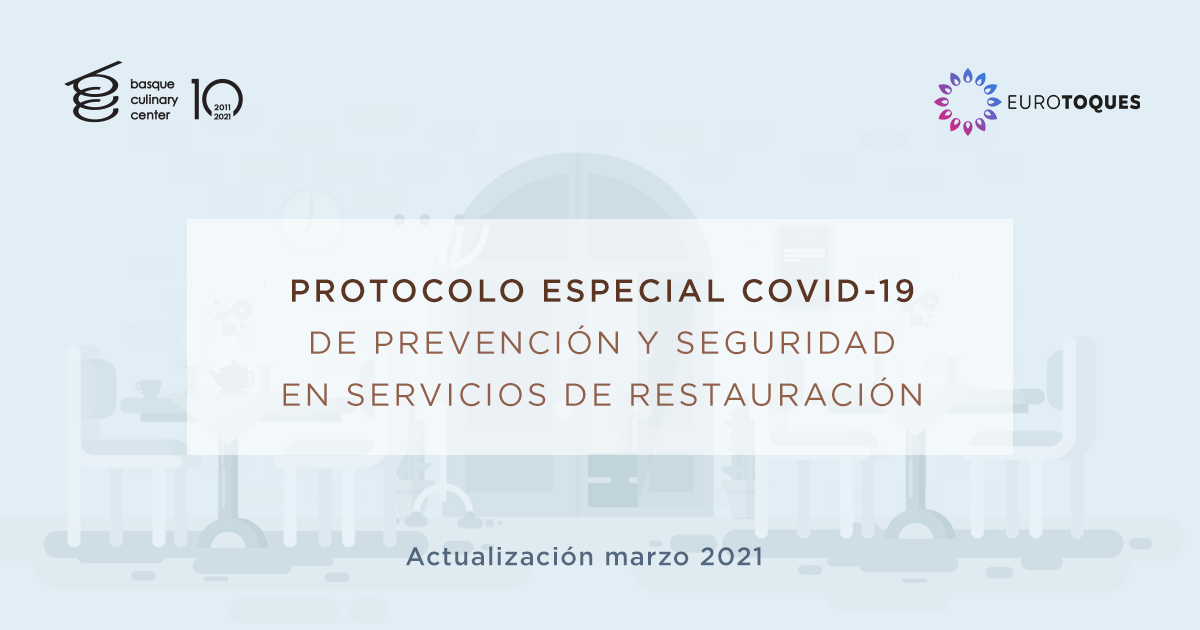 El “Protocolo Especial COVID-19 de prevención y seguridad en servicios de restauración” elaborado por Basque Culinary Center y Euro-Toques que se presentó en mayo de 2020, establece estándares exigentes y recoge actuaciones e impacta a todas las áreas del restaurante. Cada restaurante o establecimiento, en función de sus capacidades puede adaptarlo a su propia realidad. En este sentido, se destaca que la forma óptima de prevenir la transmisión es usar una combinación de todas las medidas preventivas, no solo Equipos de Protección Individual (EPI). La aplicación de una combinación de medidas de seguridad puede proporcionar un grado adicional de protección. Las medidas desgranadas en el Protocolo se refieren a aspectos relacionados con medidas de higiene en el restaurante, medidas generales de higiene del personal trabajador, sistemas de pago, experiencia gastronómica y medidas organizativas de los restaurantes que afectan a: aforo, distanciamiento físico, sala, barra, cocina, baños, recepción materia prima, etc.
