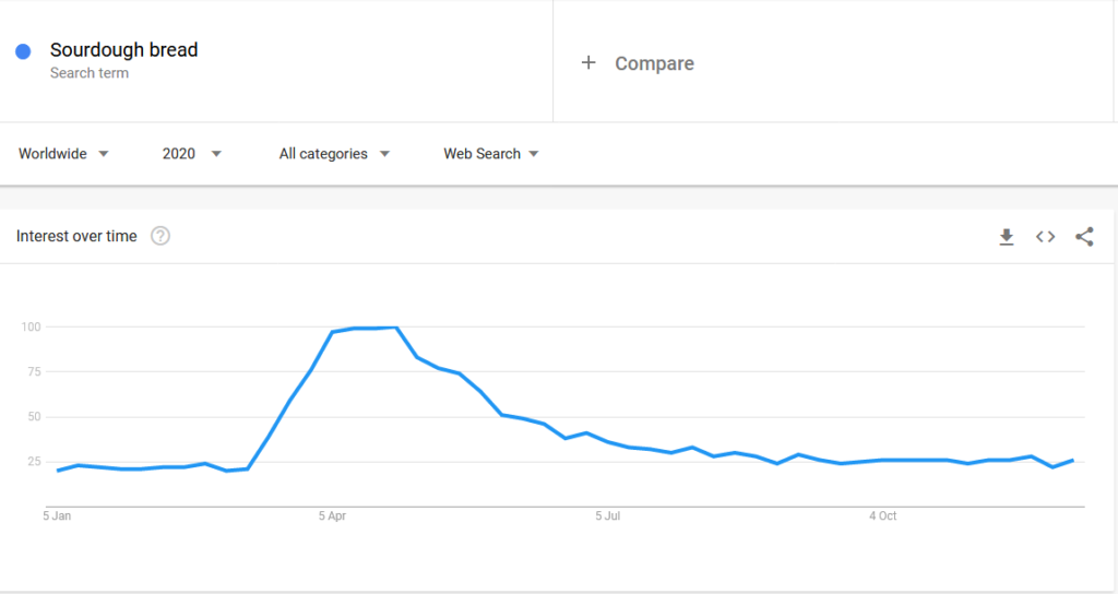 Los gráficos de Google también muestran un incremento sin precedentes a nivel global en la búsqueda de la palabra “sourdough” o “masa madre” en los meses de marzo y abril, lo que vino acompañado de problemas de suministro de harina en los supermercados en las primeras semanas de la pandemia. Sobre las repisas de las cocinas de todo el planeta comenzaron a verse tarros rellenos de experimentos a base de harina y agua que aspiraban a fermentar y a convertirse en la materia viva que diese lugar a un pan a la altura de las fotografías y vídeos con los que los usuarios iban a medir su nueva destreza. Miles de imágenes compartidas por las redes sociales dieron fe de la frustración o el orgullo de cada panadero principiante, pero más allá de migas más o menos esponjosas y cortezas más o menos cruijentes, algunos expertos coinciden en señalar los beneficios de esta actividad lenta, paciente y táctil para la salud mental de las personas en un contexto como el actual, en el que la depresión, la ansiedad y el estrés han encontrado un caldo de cultivo especialmente fértil.