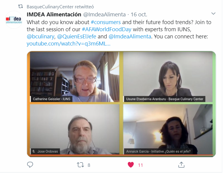 Precisamente los consumidores fueron protagonistas en la tercera mesa redonda de la jornada de esta jornada que reunió a la Doctora Catherine Geissler, secretaria general de IUNS, Usune Etxebarria Aranburu, responsable de Salud y Gastronomía en el BCC Innovation (Centro Tecnológico de Basque Culinary Center) que presento la estrategia de acercamiento holístico 360º al consumidor. Por su parte Annaïck Locqueneux, responsable de la Marca de los Consumidores presento esta plataforma, un nuevo canal de comunicación entre productores y la nueva generación de consumidores que eligen que tipo de productos quieren comprar y a qué precio.