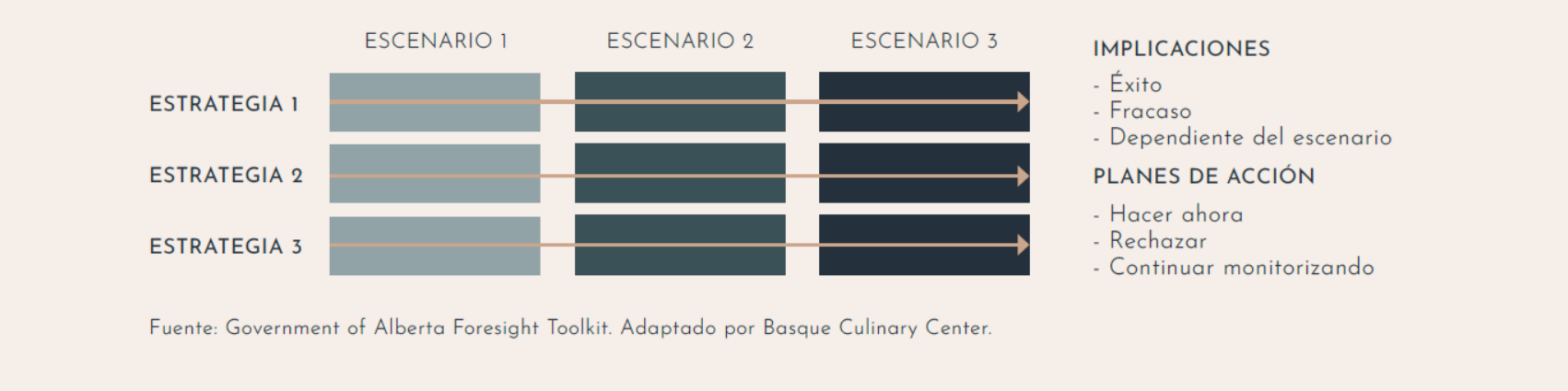 El informe se ha basado en el modelo de “Cuatro Futuros” de Jim Dator, por ser un modelo que permite observar el cambio multidimensional y analizar la complejidad, al tiempo que genera contextos diferenciados. Además, en cada escenario se tratan aspectos relacionados con los indicios, las claves del escenario macro, ideas principales que definen su contexto económico, político y social particular, las implicaciones en la gastronomía (haciendo foco en los diferentes sectores de la cadena de valor: producción, industria, distribución, comercialización y consumidores definiéndose para cada escenario).