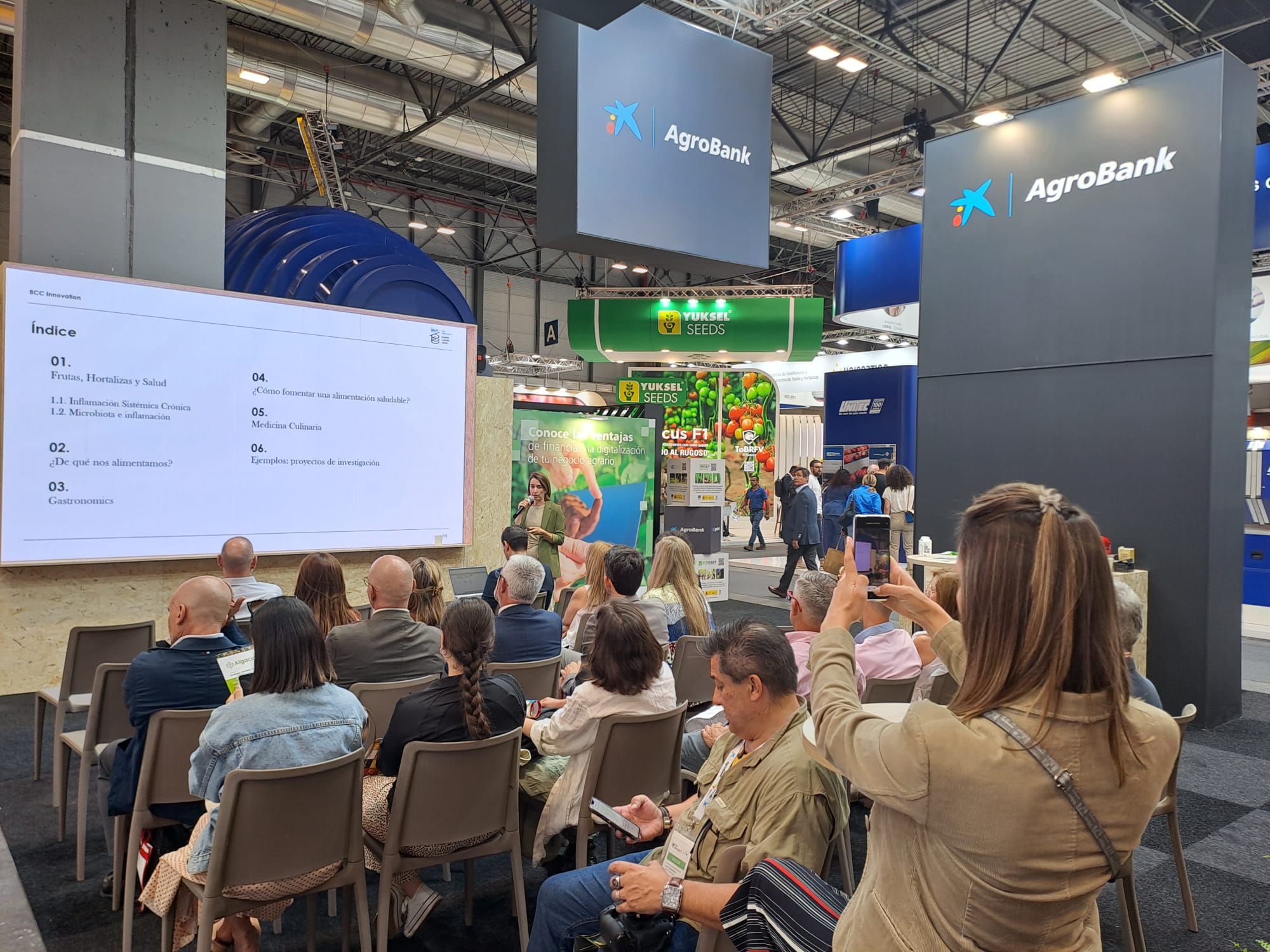 María Arrizabalaga, investigadora en el área de salud de BCC Innovation, habla sobre gastronomía saludable en el stand de AgroBank durante Fruit Attraction. Desde una visión multidisciplinar y tomando la gastronomía saludable como base, Arrizabalaga ha dado respuestas a preguntas como ¿cuál es el impacto de los alimentos de origen vegetal en la salud o cómo empoderar a las personas para que se alimenten de manera adecuada?
